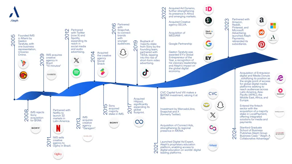 Od svojih skromnih početaka u Miamiju 2005. pa sve do pozicije globalnog lidera u ekosustavu digitalnog oglašavanja, Aleph je dosljedno izazivao status quo, rušeći prepreke i stvarajući prilike na više od 150 tržišta diljem svijeta, s 60+ ekskluzivnih partnerstava, podupirući više od 26 000 oglašivača diljem svijeta i 1500+ zaposlenika diljem svijeta.