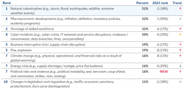Prirodne katastrofe (26 %) na 3. mjestu pokazuju jedan od najvećih pomaka, pomaknuvši se za tri mjesta. Godina iza nas bila je rekordna u nekoliko područja. Bila je to najtoplija godina od početka vođenja evidencije, dok su osigurani gubitci premašili 100 milijardi USD četvrtu godinu zaredom, potaknuti dosad najvećim iznosom za štetu od 60 milijardi USD nastalu zbog jakih grmljavinskih oluja. Diljem svijeta prirodne su katastrofe najveći rizik, među ostalim u Hrvatskoj, Grčkoj, Hong Kongu, Mađarskoj, Maleziji, Meksiku, Maroku, Sloveniji i Tajlandu, stoga ne čudi da su mnoge od tih zemalja pretrpjele neke od najznačajnijih događaja 2023. Godini. U Grčkoj je šumski požar u blizini grada Alexandroupolisa u kolovozu bio dosad najveći zabilježen u EU-u. U međuvremenu su se teške poplave u Sloveniji odrazile na jedan od najvećih događaja u opskrbnom lancu, uzrokujući kašnjenja u proizvodnji i nestašicu dijelova za europske proizvođače automobila.