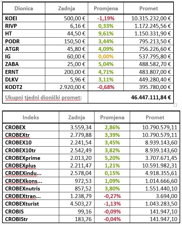 Ključni dionički indeksi zaključili su rastom te je CROBEX u tjednom plusu za 2,86 posto zaključio na 3.559,34 boda dok je CROBEX10 zabilježio tjedni rast od 3,45 posto i završio na 2.241,54 boda.