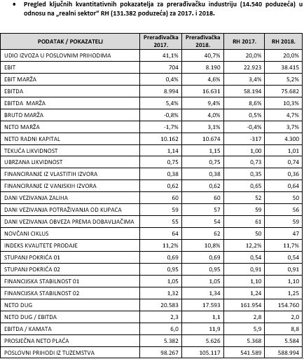 Neto rezultat koji je u 2017. bio negativan, gubitak u iznosu 2,9 milijarde kuna, u 2018. je „preokrenut“ u dobitak u iznosu 5,5 milijarda kuna. Rezultat i profitne marže prerađivačke industrije za 2017. bile su pod velikim opterećenjem troškova vrijednosnih usklađenja i rezerviranja (10,4 milijarde kuna) proisteklih iz poslovanja s Konzumom i Agrokorom, bilo da je riječ o dobavljačima izvan grupe ili velikim prerađivačima iz Agrokor grupe. U 2018. iznosi iskazani na tim pozicijama (2,3 milijarde kuna) značajno su manji, gotovo pet puta, odnosno za 8,1 milijarda kuna manje.