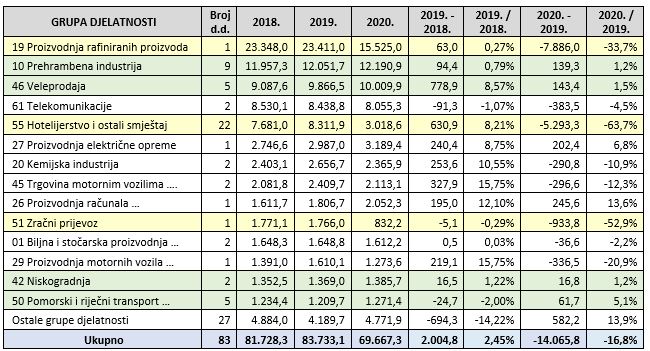 Ukupno promatrano poslovanje „teškaša“ na razini „godina na godinu“ 2020. – 2019., pad prihoda od 14.1 milijardu kuna „pretvorio“ je neto dobitak za 2019. (3.3 milijarde kuna) u neto gubitak od 69 milijuna kuna. No, pogledaju li se rezultati po grupama djelatnostima, izuzme hotelijerstvo i zračni prijevoz (Croatia Airlines) koji su pandemijom doživjeli izuzetan udarac, te INA (pad prihoda 7.9 milijardi kuna, od neto dobitka 2019. u iznosu 0,5 milijardi kuna, do 1.1 milijardi kuna neto gubitka za 2020.), nije sve tako crno. Industrijske djelatnosti, u kojima se proizvodi i izvozi, blaže su pale, zadržale, a neke su ostvarile i rast prihoda i dobiti.