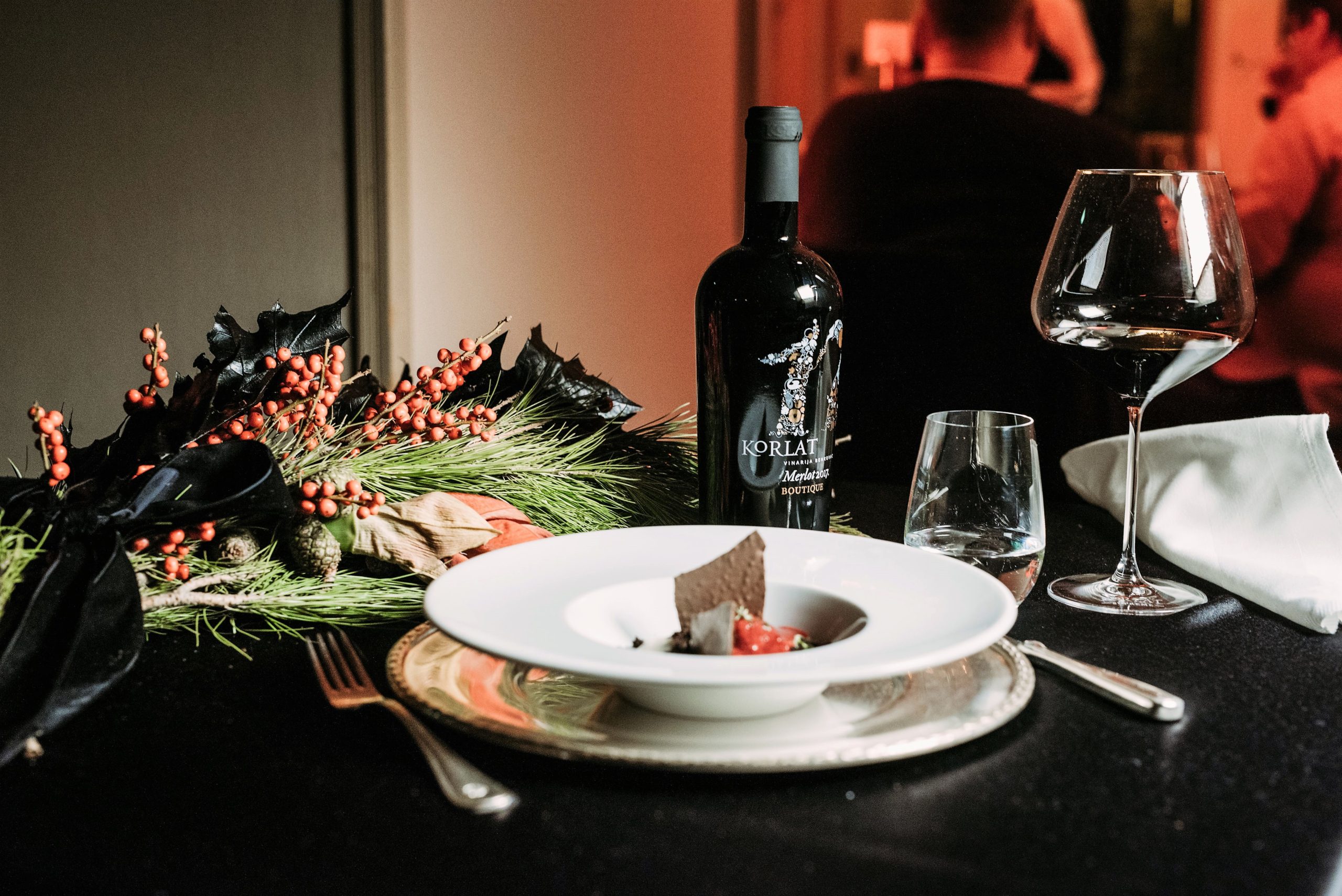 Fine rolice kelja punjene lagano dimljenim confitom od patke, crnom lećom i kardamomom dale su vjetar u leđa jakom i aromatičnom vinu Korlat Syrah 2016, a juneći obrazi, ragout od crnih truba i smrčaka te umak od timutskog papra pripremili su nepca za izrazito bogato vino Korlat Supreme Cuvee 2013. A uz desertno vino puno slatkoće Korlat Merlot Boutique 2017, savršeno su se spojili sorbeto od višnje, ušećerene višnje, crumble od tamne čokolade i meringue od kakaa.