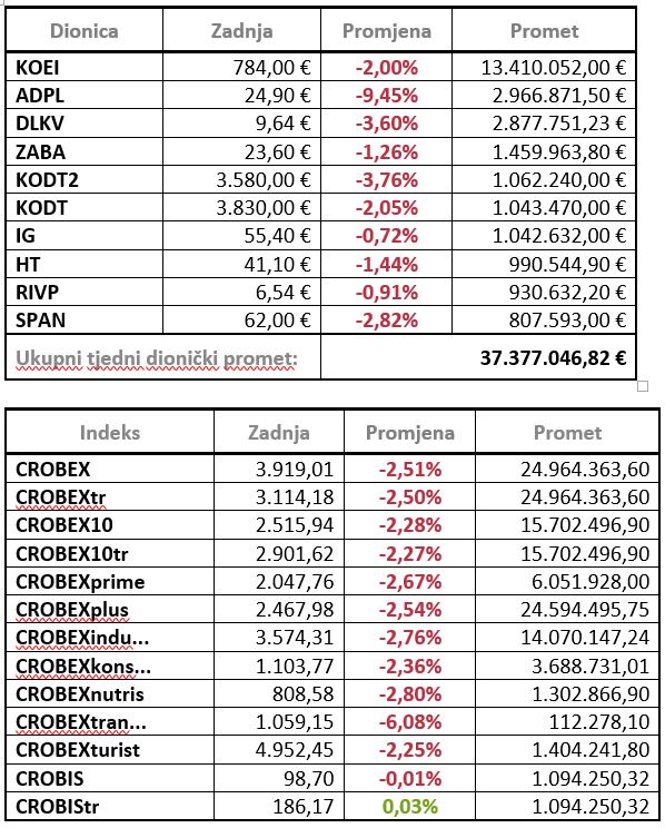 Ključni dionički indeksi zaključili su padom te je CROBEX u tjednom minusu za 2,51 posto zaključio na 3.919,01 bod dok je CROBEX10 zabilježio tjedni pad od 2,28 posto i završio na 2.515,94 boda.