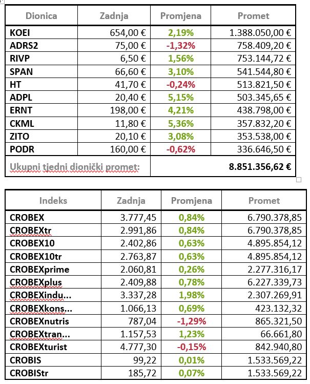 Ključni dionički indeksi zaključili su rastom te je CROBEX u tjednom plusu za 0,84 posto zaključio na 3.777,45 bodova dok je CROBEX10 zabilježio tjedni rast od 0,63 posto i završio na 2.402,86 bodova.
