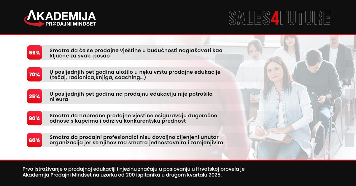Zagreb, 23. listopada 2025. (GIA) – Više od 56 posto ispitanika istraživanja o prodajnoj edukaciji i njezinu značaju u poslovanju smatra da će se prodajne vještine u budućnosti naglašavati kao ključne za svaki posao. Dio je to rezultata istraživanja, prvoga takve vrste u Hrvatskoj, koje je Akademija Prodajni Mindset provela na uzorku od 200 ispitanika tijekom drugog kvartala ove godine, u povodu najvećeg ovogodišnjeg okupljanja stručnjaka za prodaju u Hrvatskoj i regiji, konferencije Sales4Future.