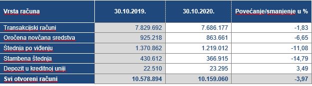 Najveći pad broja otvorenih računa odnosi se na stambenu štednju (14,79%), te štednju po viđenju (11,08%), dok je jedini porast u odnosu na prethodnu godinu zabilježen kod broja računa depozita u kreditnim unijama (3,49%).