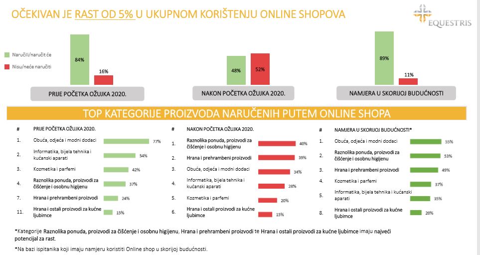 Istraživanje je pokazalo da se prema namjeri online kupovine u skorijoj budućnosti može očekivati ponovni rast tih kategorija, dok kategorije Raznolike ponude, proizvoda za čišćenje i osobnu higijenu, Hrane i prehrambenih proizvoda te Hrane i ostalih proizvoda za kućne ljubimce imaju najveći potencijal za rast.