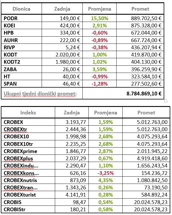 Ključni dionički indeksi zaključili su rastom te je CROBEX u tjednom plusu za 1,59 posto zaključio na 3.193,77 bodova dok je CROBEX10 zabilježio tjedni rast od 2,68 posto i završio na 1.998,98 bodova.