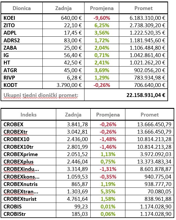Ključni dionički indeksi zaključili su padom te je CROBEX u tjednom minusu za 0,26 posto zaključio na 3.841,78 bodova dok je CROBEX10 zabilježio tjedni pad od 1,48 posto i završio na 2.436 bodova.