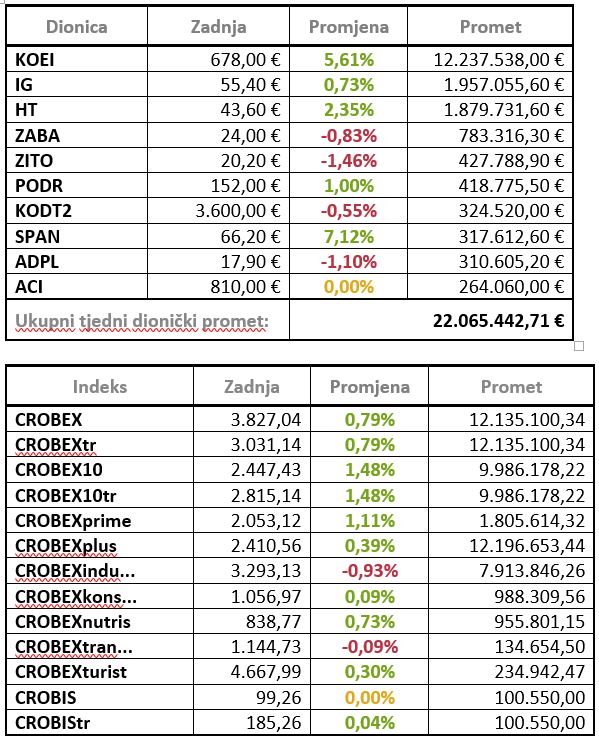 Ključni dionički indeksi zaključili su rastom te je CROBEX u tjednom plusu za 0,79 posto zaključio na 3.827,04 boda dok je CROBEX10 zabilježio tjedni rast od 1,48 posto i završio na 2.447,43 boda.