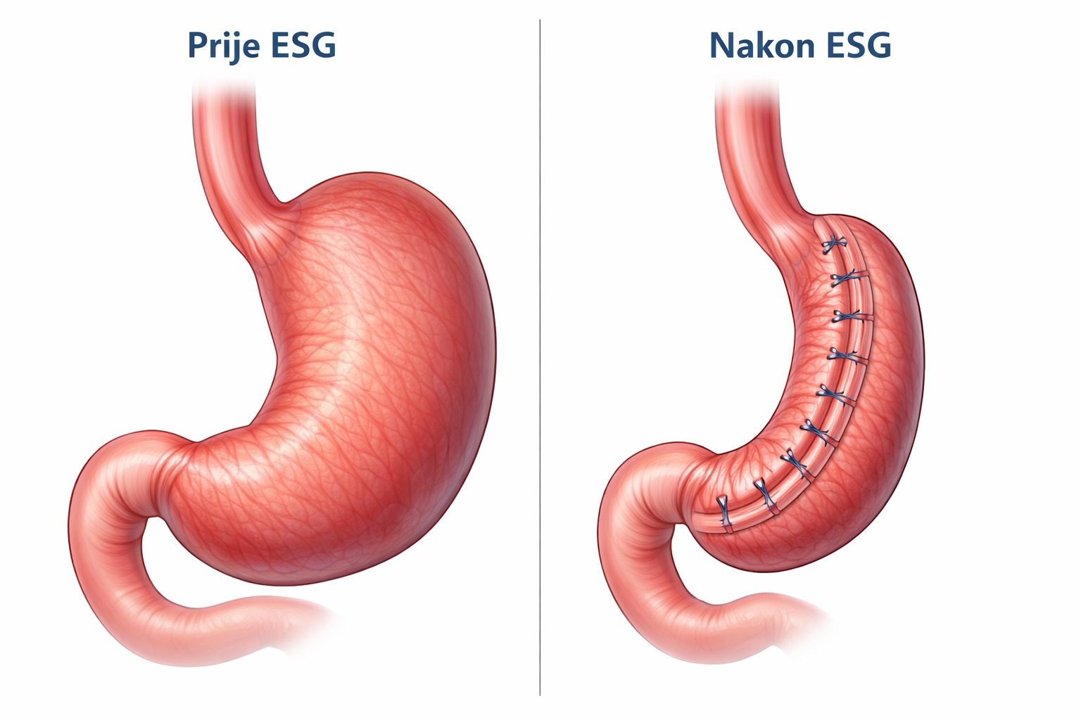 Za razliku od kirurških zahvata, kod ESG-a se ne odstranjuje dio želuca i ne mijenja se anatomija probavnog sustava trajno. Zahvat je manje invazivan, nosi manji rizik komplikacija, oporavak je brži, a metoda je u određenim slučajevima reverzibilna.