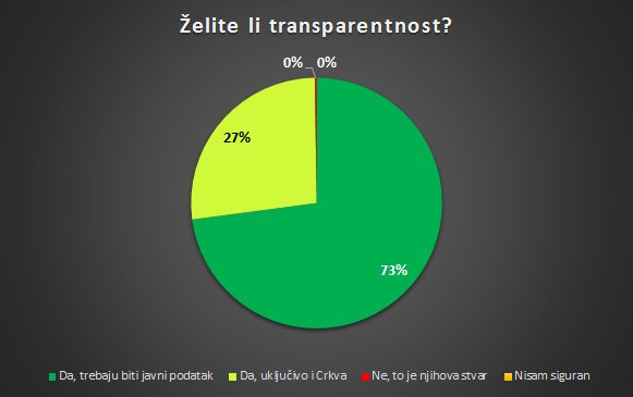 Zagreb, 16. travnja 2020. – Transparentnost na svim razinama je nužna i mora se uvesti, stav je gotovo 100 posto ispitanika u anketi koju je provela Udruga Glas poduzetnika. Takav izravan stav dijeli 73 posto ispitanika, dok je nešto manje od 23 posto njih suglasno kako je transparentnost nužna, ali je dodalo i Crkvu za koju također smatraju kako je potrebno da iona funkcionira transparetno. Zanemariv postotak ljudi, 0,2%, smatrao da transparentnost nije potrebna.